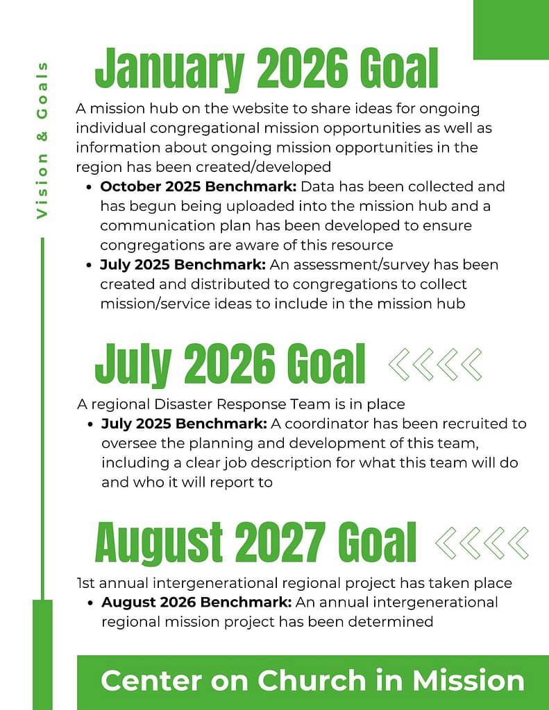 To identify ministries in which the Regional Church can incubate, foster, sustain, and/or partner with Local Churches in no more than five areas of mission during the current biennium, and connect such ministries to related General Church Ministries. Ministries may be hands-on initiatives (e.g., refugee resettlement, disaster recovery), training (e.g., anti-racism), and/or mission trips.
